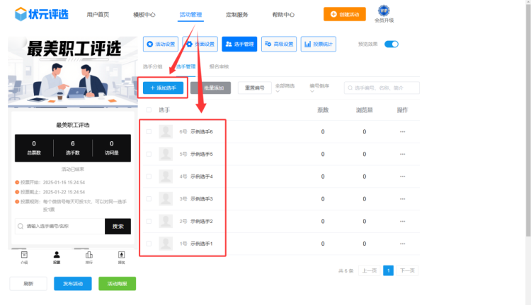 第五步,上传选手信息:在【选手管理】中,点击【添加选手】或【示例选手】,依次上传所有参选人员的资料。包括选手的名称、简介、照片或者视频等,确保信息准确、完整,能够充分展示选手的特点和优势。