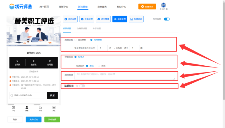 第六步,设置投票规则:在【高级设置】中,完成投票规则的设置。