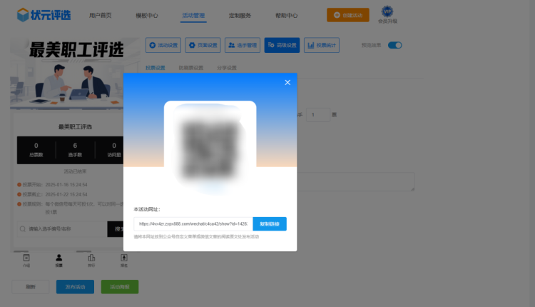 第七步,发布活动:上述步骤完成后,仔细检查活动信息、选手资料和投票规则等内容,确保无误后,点击【发布活动】。系统会自动生成投票链接和二维码,将其保存下来,并分享至微信公众号、朋友圈、微信群等渠道,邀请大家参与投票,即可开启评选活动。