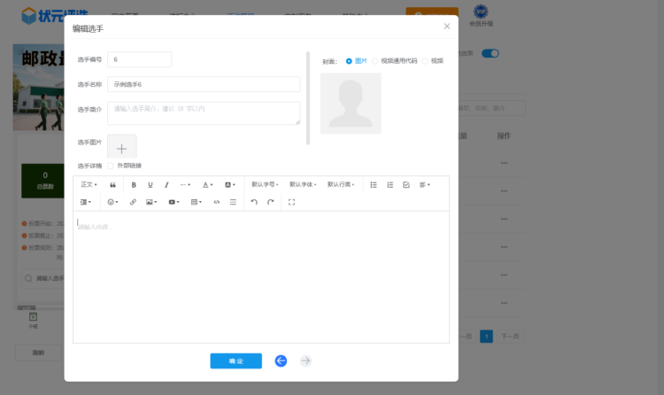 然后,在【选手管理】中,上传所有选手的个人资料,包括选手的名称、简介、照片或者视频等。