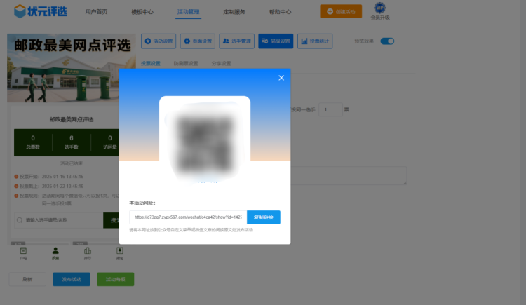 最后,上述操作完成后,点击【发布活动】,系统会自动生成投票链接和二维码。这样邮政最美网点在线投票评选活动就制作完成了,是不是很简单?