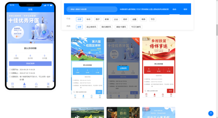 成功登录后,系统会自动跳转至活动后台。点击【模板中心】,可以看到各式各样的模板,如五四青年节、三八红旗手、五一劳动节等,选定合适的可一键套用。
