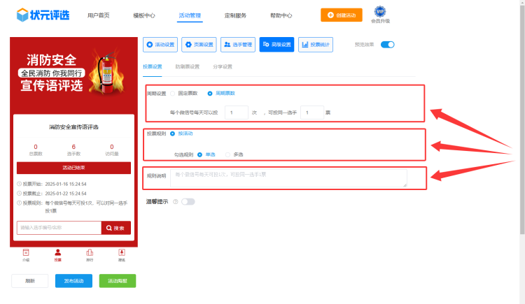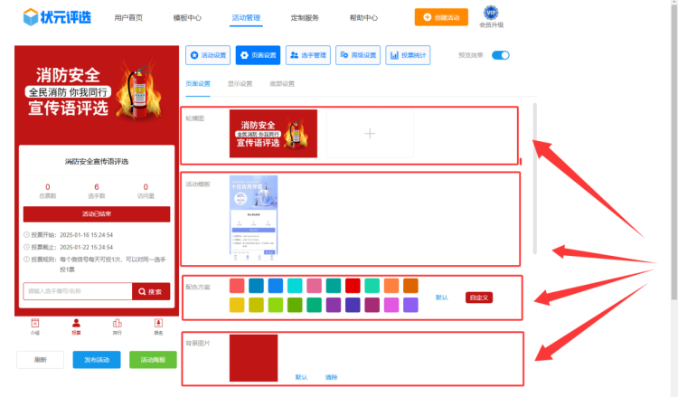 在【活动设置】中,修改活动名称、设置活动时间、编辑活动信息(包括活动名称、时间、评选标准、奖项设置)。