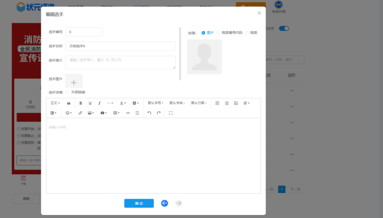 在【选手管理】中,上传所有选手的个人资料,包括选手的名称、简介、照片或者视频等。