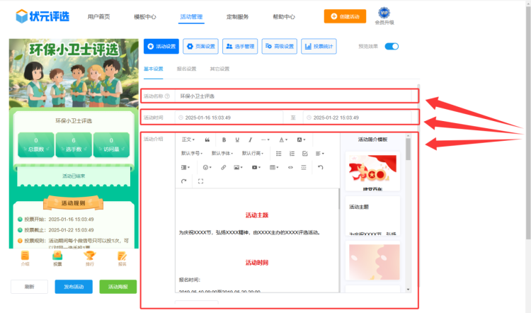 第三步,在【活动设置】中,修改活动名称、设置活动起止时间、编辑活动介绍。