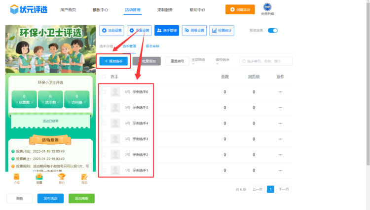 第五步,在【选手管理】中,上传所有选手的个人资料,包括选手的名称、简介、照片或者视频等。