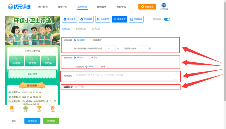 第六步,在【高级设置】中,设置投票规则,如活动期间,可以给几名选手投票、又能够投几票等。