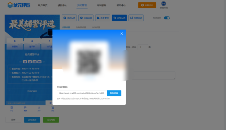 最后,点击【发布活动】,系统会自动生成投票链接和二维码。这样一场微信投票评选活动就制作完成了,是不是很简单?