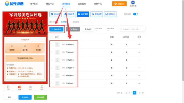 第五步,在【选手管理】中,上传所有选手的个人资料,包括选手的名称、简介、照片或者视频等。