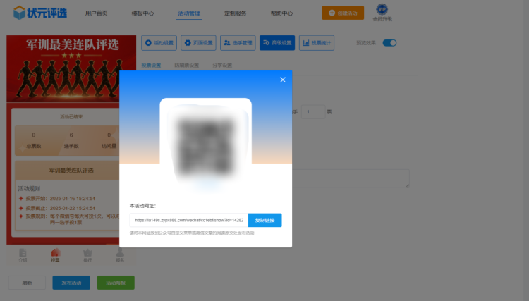 第七步,上述操作完成,且仔细检查确定无误后,点击【发布活动】,系统会自动生成投票链接和二维码。这样军训最美连队在线投票评选活动就制作完成了,您学会了吗?