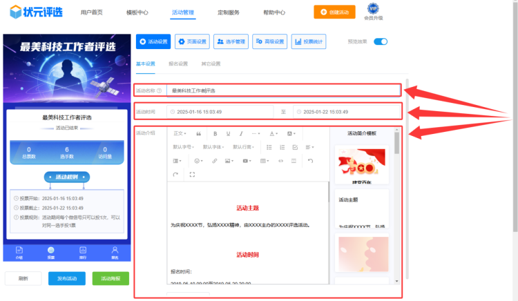 再者,在【活动设置】中,编辑活动信息,包括活动名称、时间、简介。