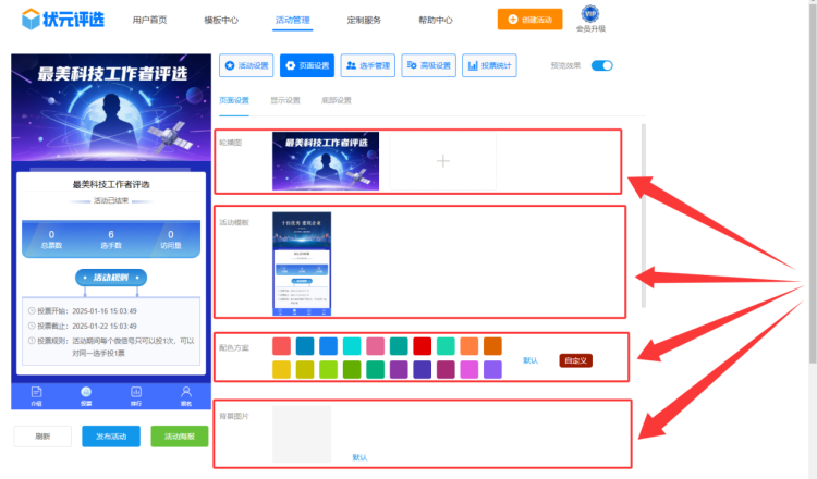 此外,在【页面设置】中,上传主题轮播图,并根据活动需要,完成其他页面设置上的操作,如添加背景音乐、漂浮物等。
