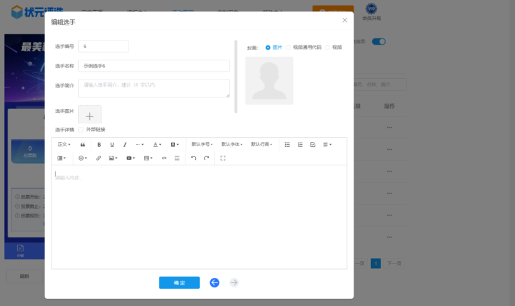 然后,在【选手管理】中,上传所有选手的个人资料,包括选手的名称、简介、照片或者视频等。
