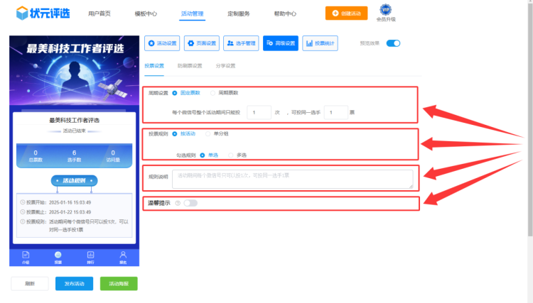 再然后,在【高级设置】中,完成投票规则的设置,如活动期间,可以给几名选手投票、又可以投几票等。
