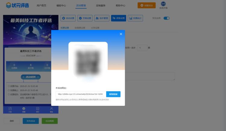 最后,上述步骤完成后,直接点击【发布活动】,系统会自动生成投票链接和二维码。这样一场网络投票评选活动就制作完成了,是不是很简单?
