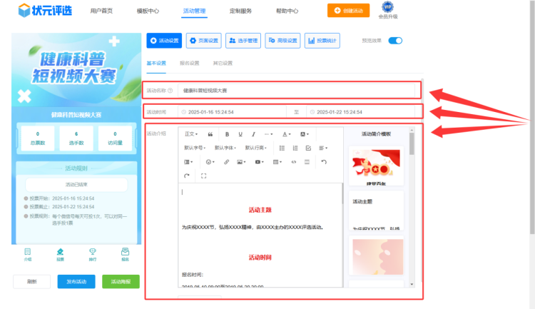 第三步,在【活动设置】中,修改活动名称、设置活动时间、编辑活动介绍。