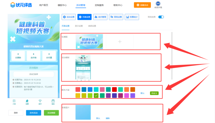 第四步,在【页面设置】中,上传主题轮播图,并根据轮播图的颜色,来调整配色方案、更换背景图片等。