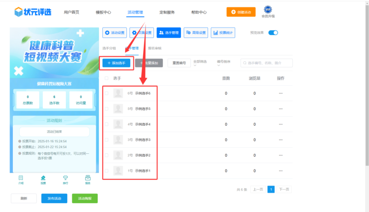 第五步,在【选手管理】中,上传所有选手的个人资料,包括选手的名称、简介、照片或者视频等。