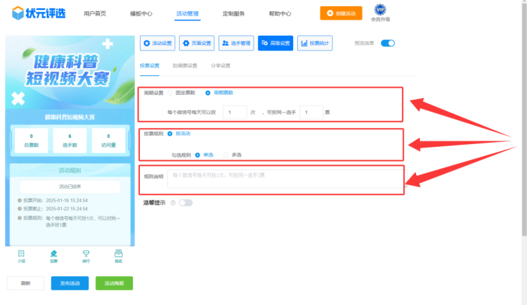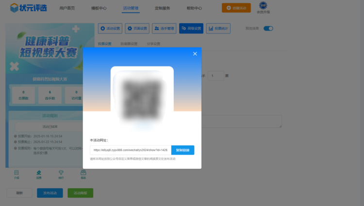 第七步,上述操作完成,且仔细检查确定无误后,点击【发布活动】,系统会自动生成投票链接和二维码。将其保存下来并分享出去,即可开启投票评选活动,选出最终的获胜者。