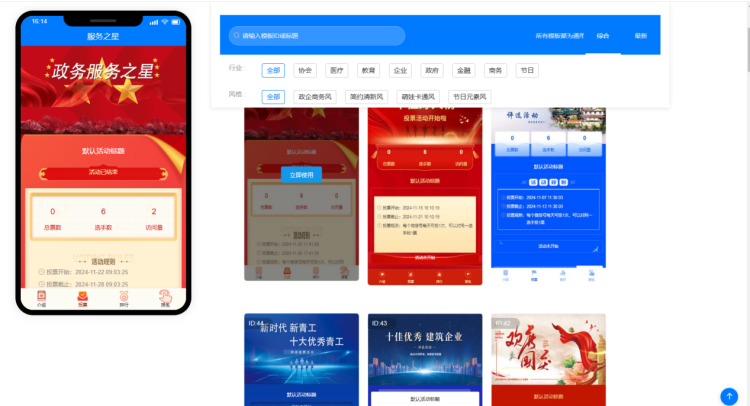第二步,登录后,系统会自动跳转至活动后台。点击【模板中心】,选择与主题相契合的模板样式,如五一劳动节、五四青年节等模板。