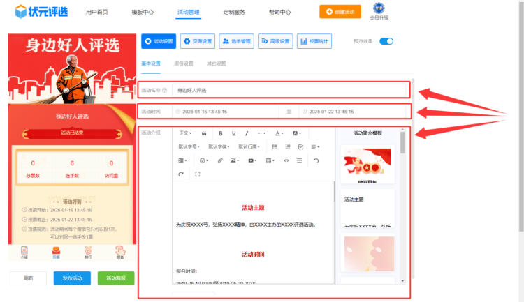 第三步,在【活动设置】中,将活动名称改为身边好人评选,并设置活动起止时间、编辑活动介绍。
