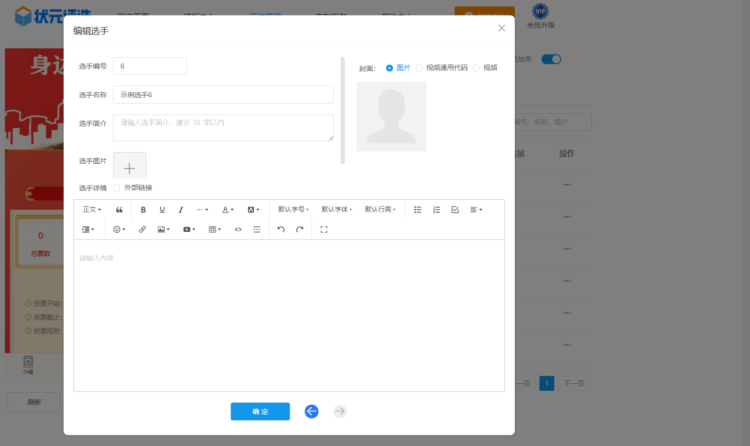 第五步,在【选手管理】中,上传所有选手的个人资料,包括选手的名称、简介、照片或者视频等。