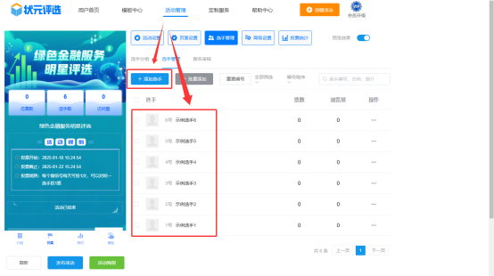 第五步,在【选手管理】中点击【添加选手】或者【示例选手】,上传所有选手的个人资料,包括选手的名称、简介、照片或者视频等。