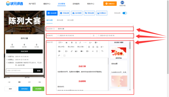 第三步,在【活动设置】中,修改活动名称、设置活动时间、编辑活动介绍。
