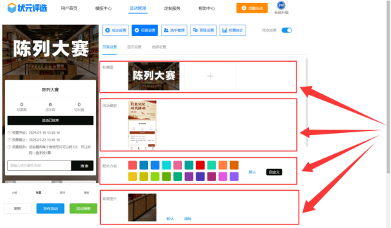 第四步,在【页面设置】中,上传主题轮播图,并根据轮播图的颜色,来调整配色方案、更换背景图片等。