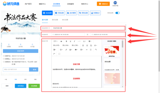再者,在【活动设置】中,编辑活动信息,包括活动名称、时间、简介。