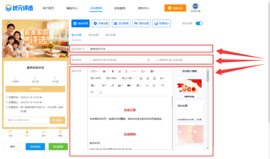 再者,在【活动设置】中,编辑活动信息,包括活动名称、时间、简介。