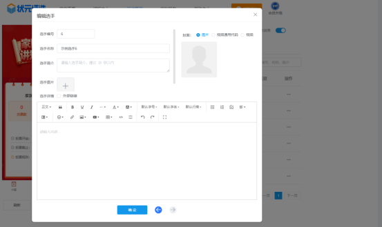 第五步,在【选手管理】中,上传所有选手的个人资料,包括选手的名称、简介、照片或者视频等。