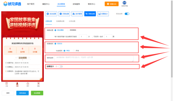 第六步,在【高级设置】中,设置投票规则,如活动期间,可以给几名选手投票、又能够投几票等。
