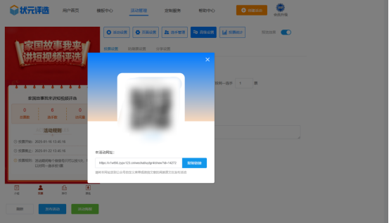 第七步,点击【发布活动】,系统会自动生成投票链接和二维码。这样一场与国庆相关的网络投票评选活动就制作完成了,是不是很简单?