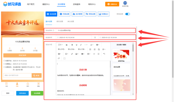 第三步,在【活动设置】中,修改活动名称、设置活动时间、编辑活动介绍。
