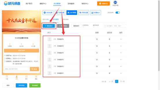 第五步,在【选手管理】中,上传所有选手的个人资料,包括选手的名称、简介、照片或者视频等。