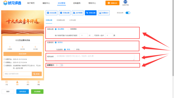 第六步,在【高级设置】中,设置投票规则,如活动期间,可以给几名选手投票、又能投几票等。