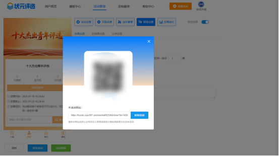 第七步,上述操作完成,且仔细检查确定无误后,点击【发布活动】,系统会自动生成投票链接和二维码。将其保存下来并分享至微信群、朋友圈等社交媒体,即可开启投票评选活动,选出最终的获胜者。