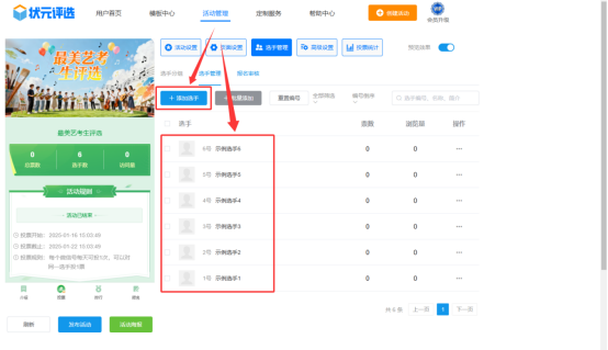 第五步,在【选手管理】中,上传所有选手的个人资料,包括选手的名称、简介、照片或者视频等。
