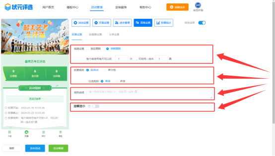 第六步,在【高级设置】中,设置投票规则,如活动期间,可以给几名选手投票,又能投几票等。