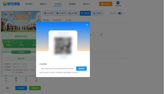 第七步,上述步骤完成,且仔细检查确定无误后,点击【发布活动】,系统会自动生成投票链接和二维码。这样一场微信投票评选活动就制作完成了,是不是很简单?