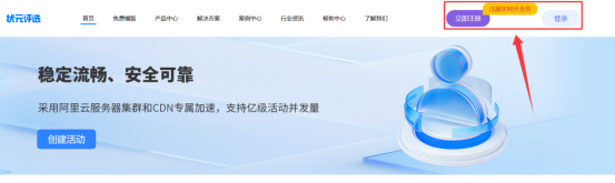 首先,进入状元评选投票制作平台上,右上角点击【注册】按钮,输入手机号、验证码等信息,注册账号。老用户直接登录即可。