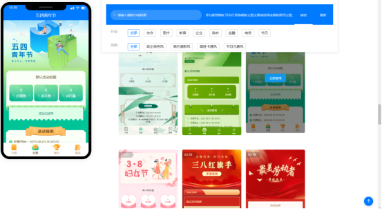 其次,登录后,系统会自动跳转至活动后台。在【模板中心】,选定合适的模板样式可直接一键套用。