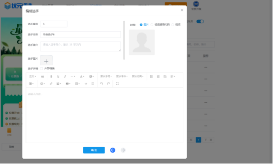 然后,在【选手管理】中,上传所有选手的个人资料,包括选手的名称、简介、照片或者视频等。