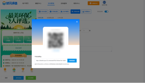 最后,点击【发布活动】,系统会自动生成投票链接和二维码。这样一场视频类网络投票评选活动就制作完成了,您学会了吗?