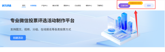 进入状元评选投票制作平台上,右上角点击【注册】按钮,输入手机号、验证码等信息,注册账号。老用户直接登录即可。