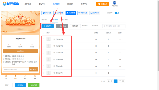 然后,在【选手管理】中,上传所有选手的个人资料,包括选手的名称、简介、照片或者视频等。