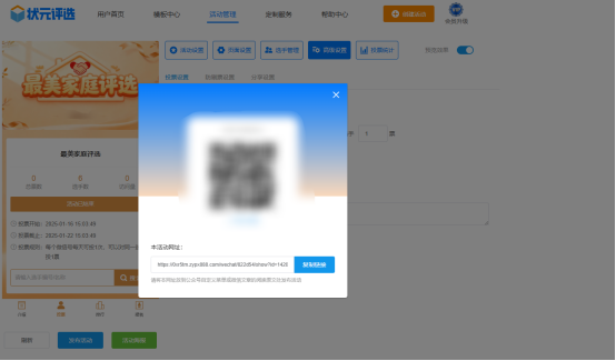 最后,点击【发布活动】,系统会自动生成投票链接和二维码。这样一场网络投票评选活动就制作完成了,是不是很简单?