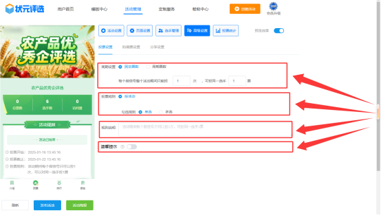 找到平台内高级设置选项,按需设置投票相关规则,同步开启防刷票机制,强化活动风控管理,有效杜绝违规刷票行为。