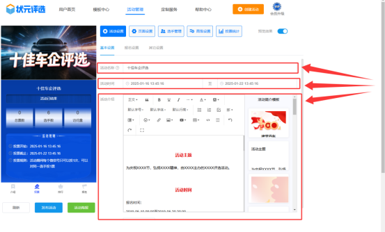 进入活动设置板块后,把活动名称修改为 “十佳车企评选”,合理设定活动的开始与结束时间,同时详细编辑活动介绍,清晰呈现活动核心信息。